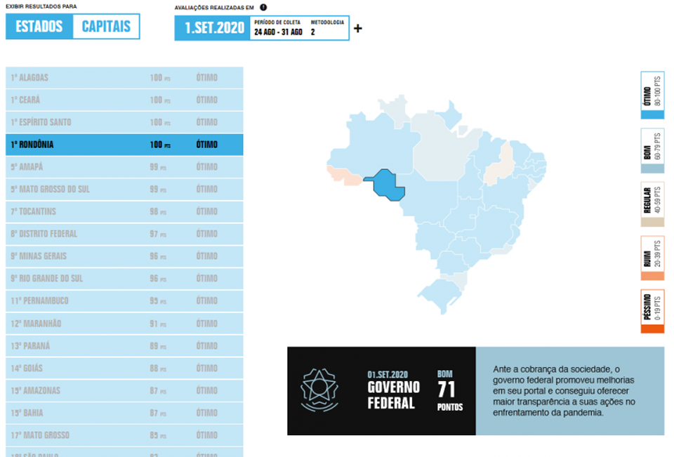 Juntamente com Rondônia, ocuparam também as primeiras colocações os estados de Alagoas, Ceará e Espírito Santo. O resultado é avaliado por meio de uma pontuação de 0 a 100. Quanto mais perto de 100, demonstra que o Estado está divulgando detalhadamente seus contratos, isto é, sendo transparente. De acordo com a Transparência Internacional Brasil, o governo federal alcançou o nível de transparência categorizado com “bom” com o quantitativo de 71 pontos.