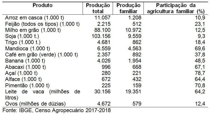 Com base nos dados do Censo Agropecuário 2016-2017, foi elaborada uma lista com uma cesta de 65 produtos agrícolas, abrangendo a produção de grãos, cana-de-açúcar, hortaliças e espécies frutíferas. No conjunto desses 65 produtos, a participação da agricultura familiar foi de apenas 5,7%. Quando se exclui, desta cesta, a soja, o milho, o trigo e a cana-de-açúcar, que são culturas industriais cultivadas em médias e grandes áreas, a participação da agricultura familiar alcançou 30% do total produzido, em toneladas.