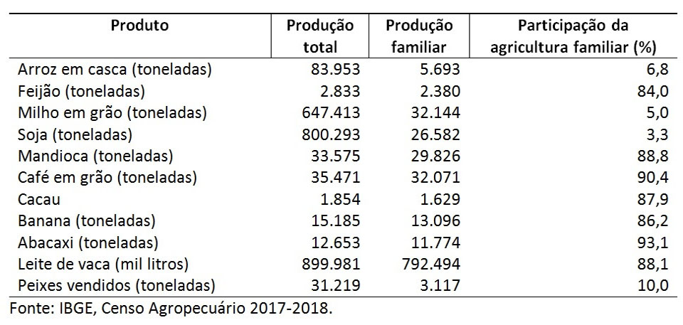 Dentre os produtos mais importantes cultivados no estado, o abacaxi se sobressai, com 93,1% da produção sendo advinda da agricultura familiar, seguida do café (90,4%), da mandioca (88,8%) e do cacau (87,9%). Na pecuária, destaque para a produção de leite, com participação de 88,1%. A Tabela 2 lista os principais produtos do estado e a participação da agricultura familiar na sua produção.