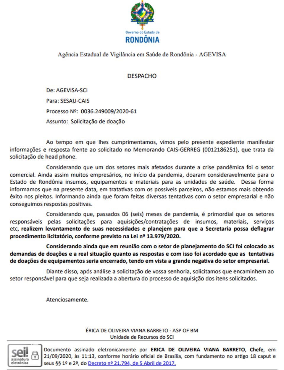 “Considerando que um dos setores mais afetados durante a crise pandêmica foi o setor comercial. Ainda assim muitos empresários, no início da pandemia, doaram consideravelmente para o Estado de Rondônia insumos, equipamentos e materiais para as unidades de saúde. Dessa forma informamos que na presente data, em tratativas com os possíveis parceiros, não estamos mais obtendo êxito nos pleitos. Informando ainda que foram feitas diversas tentativas com o setor empresarial e não conseguimos respostas positivas”.