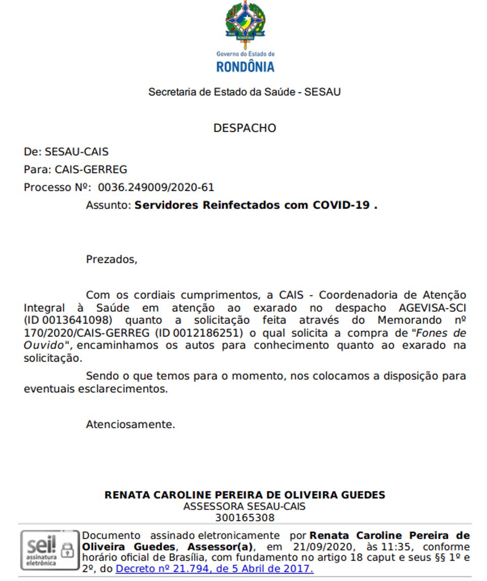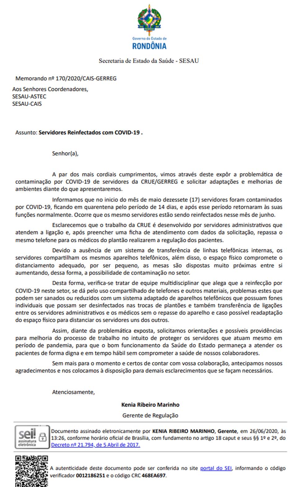 Porto Velho, RO – O jornal eletrônico Rondônia Dinâmica teve acesso exclusivo a um Memorando expedido por Kenia Ribeiro Marinho, gerente da Central de Regulação de Urgência e Emergência de Rondônia (CRUE/RO), onde alertou, há quase três meses, sobre casos de reinfecção do novo Coronavírus (COVID-19) em diversos servidores do setor.