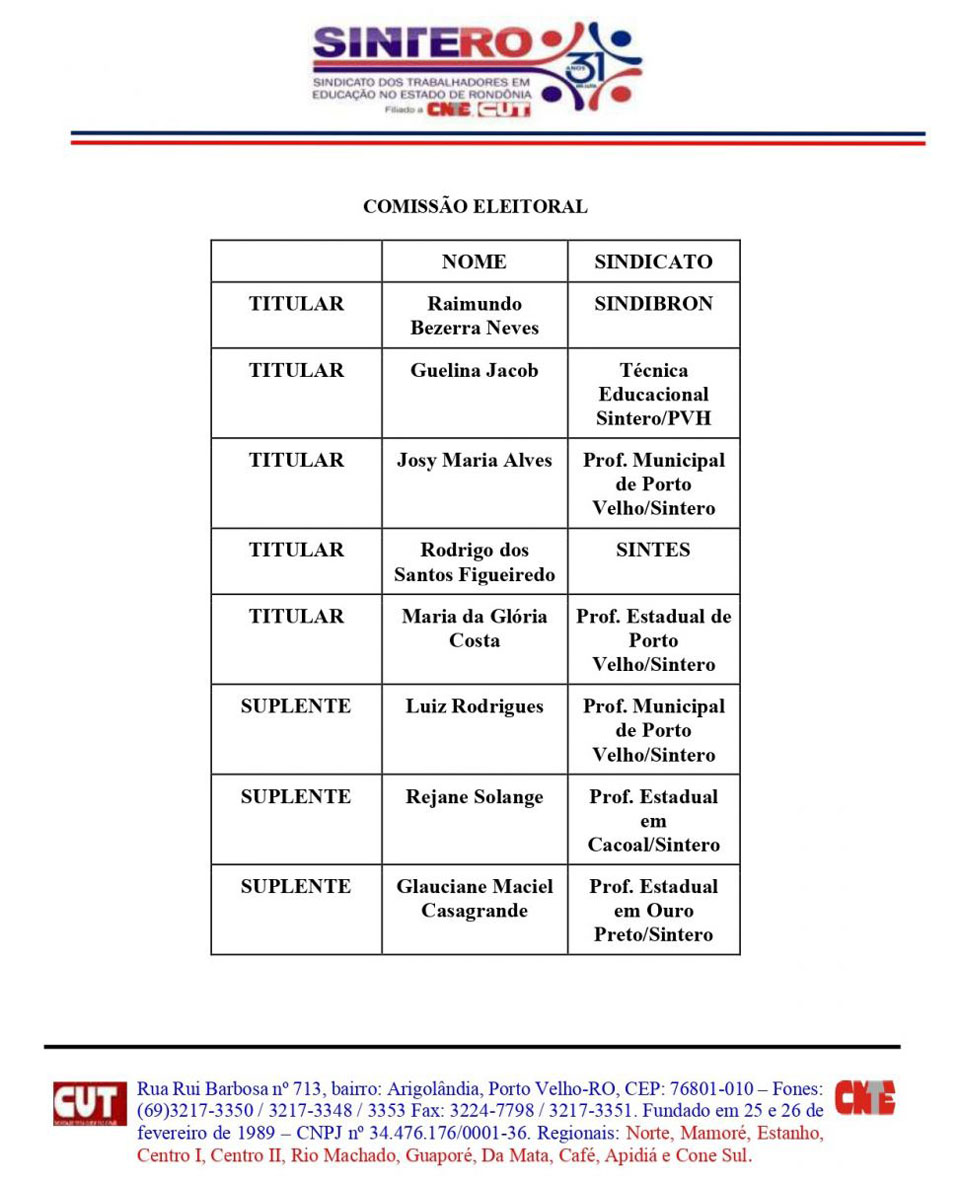 VEJA O NOME DOS INTEGRANTES DA COMISSÃO ELEITORAL DO SINTERO: