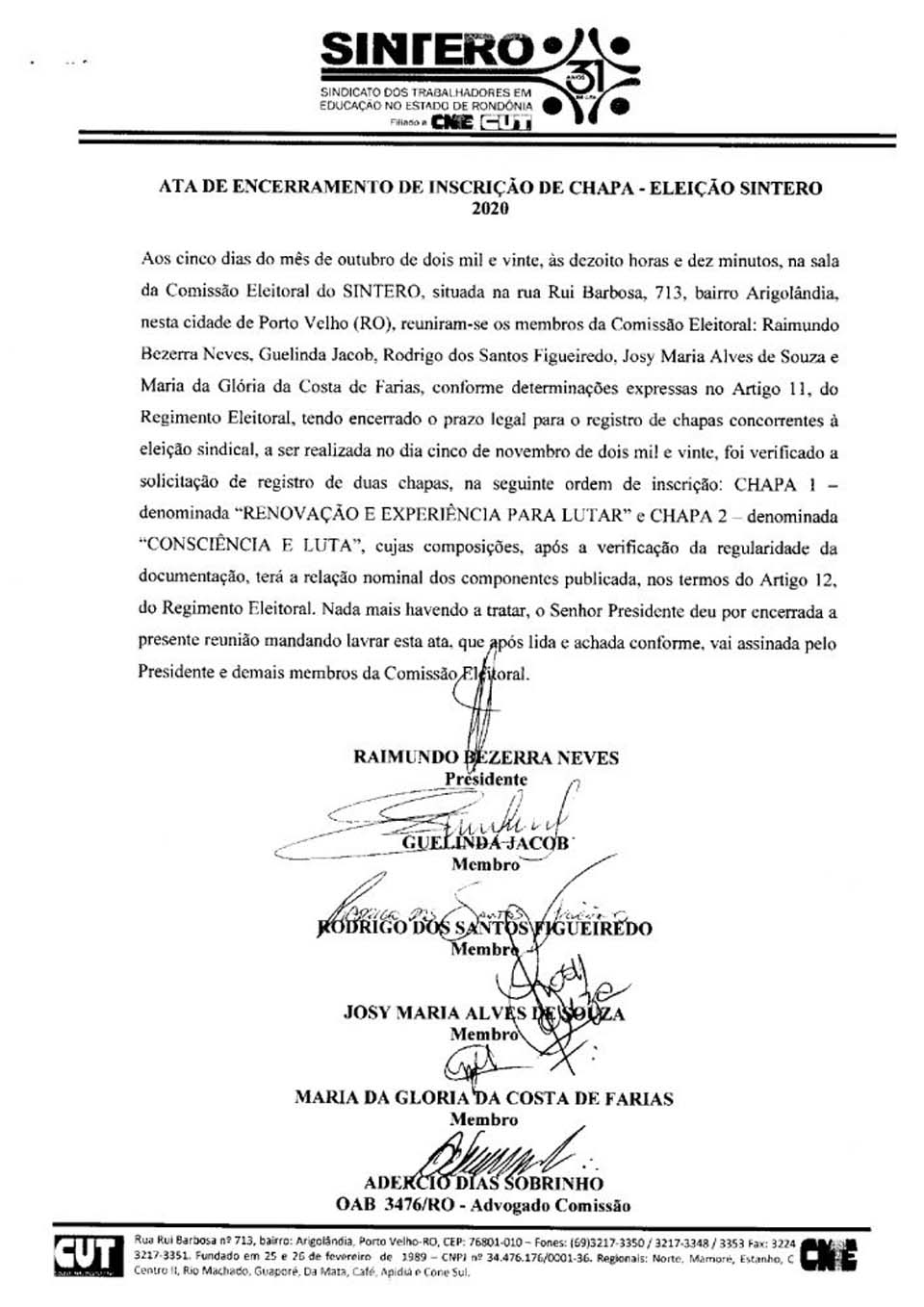 O Sindicato dos Trabalhadores em Educação do Estado de Rondônia - SINTERO, divulgou nesta terça-feira (6), para o conhecimento dos filiados e demais interessados, a ata de encerramento de inscrição de chapa - Eleição Sintero 2020. Confira: