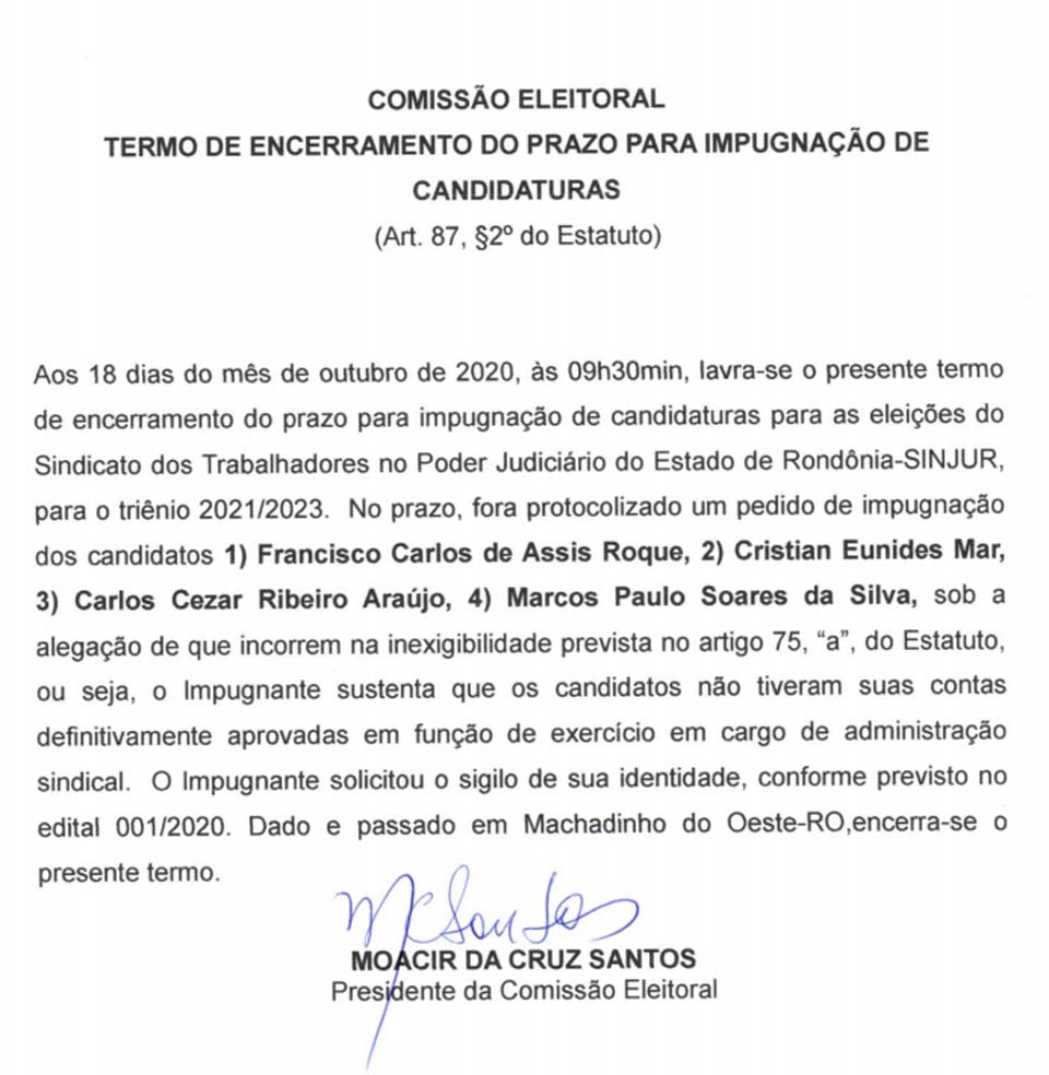 Confira o documento de termo de encerramento do prazo de impugnação de candidaturas