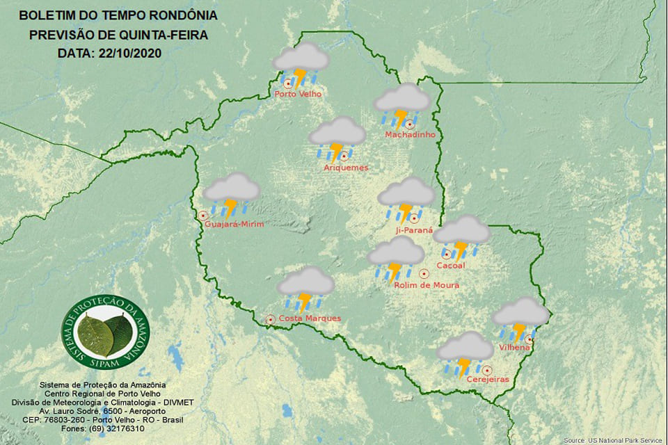 Somente no Sul rondoniense o sol aparece com força. O tempo varia de parcialmente nublado a nublado e ocorrem pancadas de chuva com trovoadas entre a tarde e a noite. Há possibilidade de temporais em todo o Estado, mas que devem ocorrer de forma pontual.