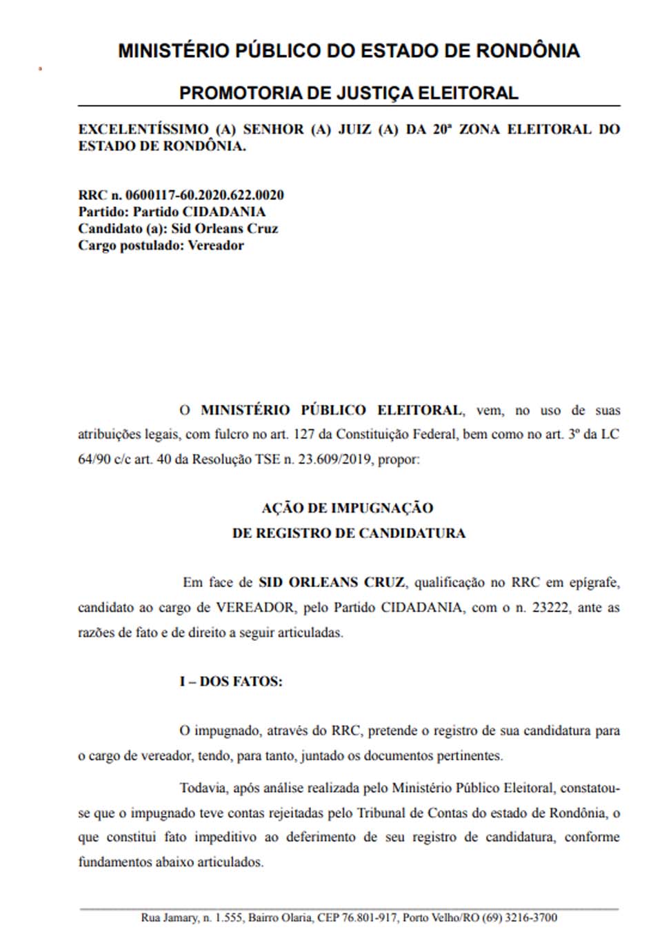Porto Velho, RO – O Ministério Público Eleitoral, em ação promovida pela promotora Tânia Garcia Santiago, apresentou denúncia contra o registro de candidatura de Sid Orleans, ex-vereador da Capital, hoje no Cidadania.
