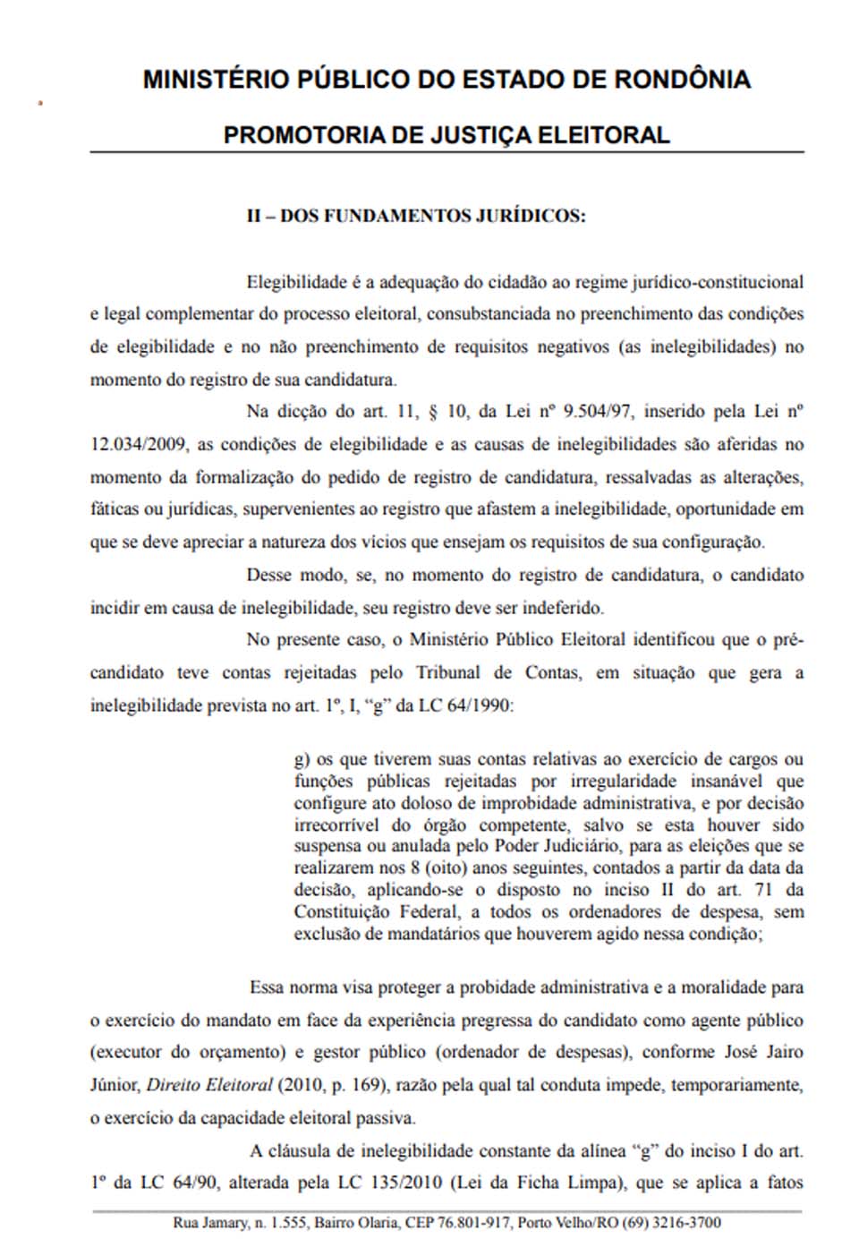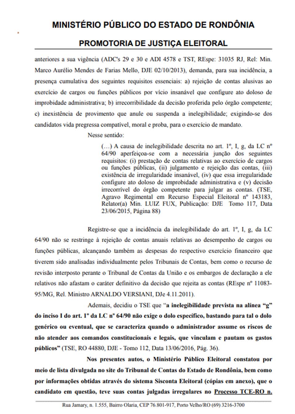 “Todavia, após análise realizada pelo Ministério Público Eleitoral, constatou-se que o impugnado teve contas rejeitadas pelo Tribunal de Contas do estado de Rondônia, o que constitui fato impeditivo ao deferimento de seu registro de candidatura”.