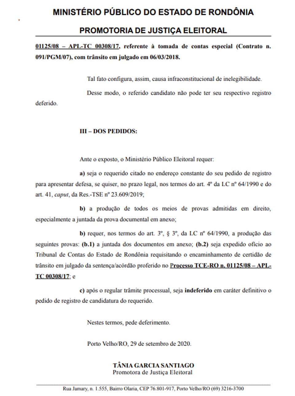 O Ministério Público Eleitoral constatou por meio de lista divulgada no site do Tribunal de Contas do Estado de Rondônia, bem como por informações obtidas através do sistema Sisconta Eleitoral, “que o candidato em questão, teve suas contas julgadas irregulares no Processo TCE-RO n01125/08 – APL-TC 00308/17, referente à tomada de contas especial (Contrato n. 091/PGM/07), com trânsito em julgado em 06/03/2018”.