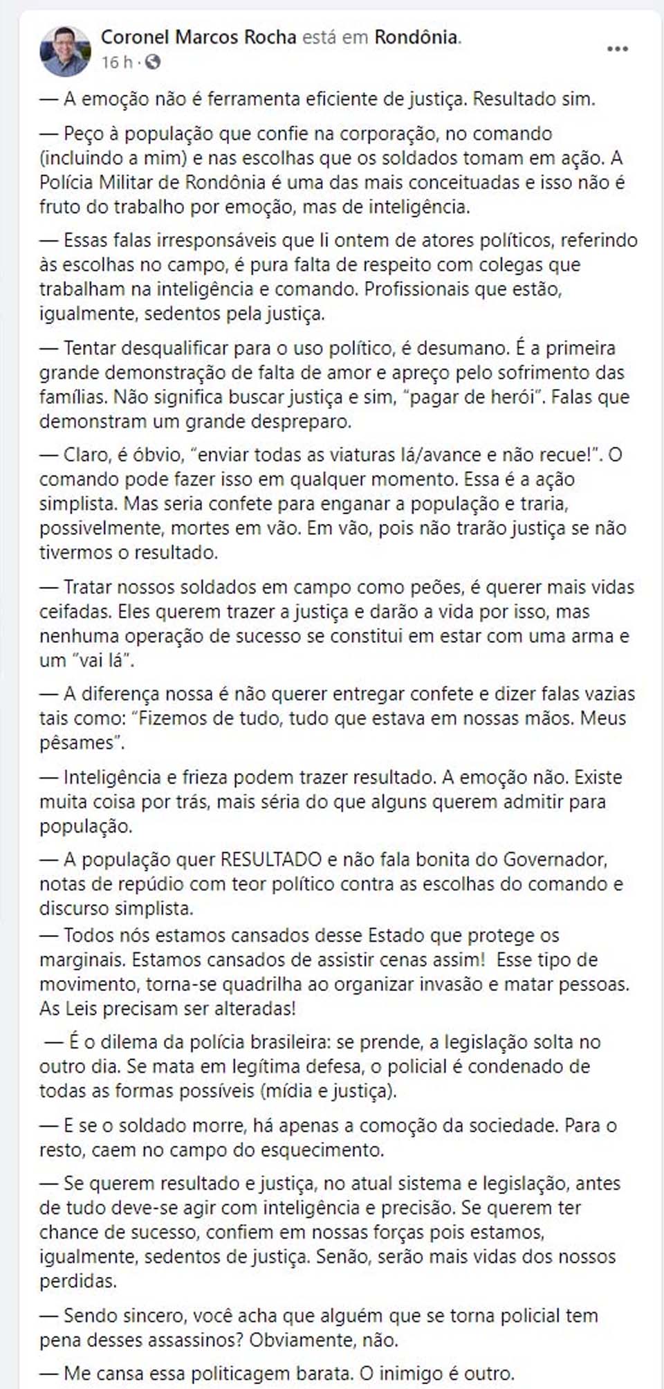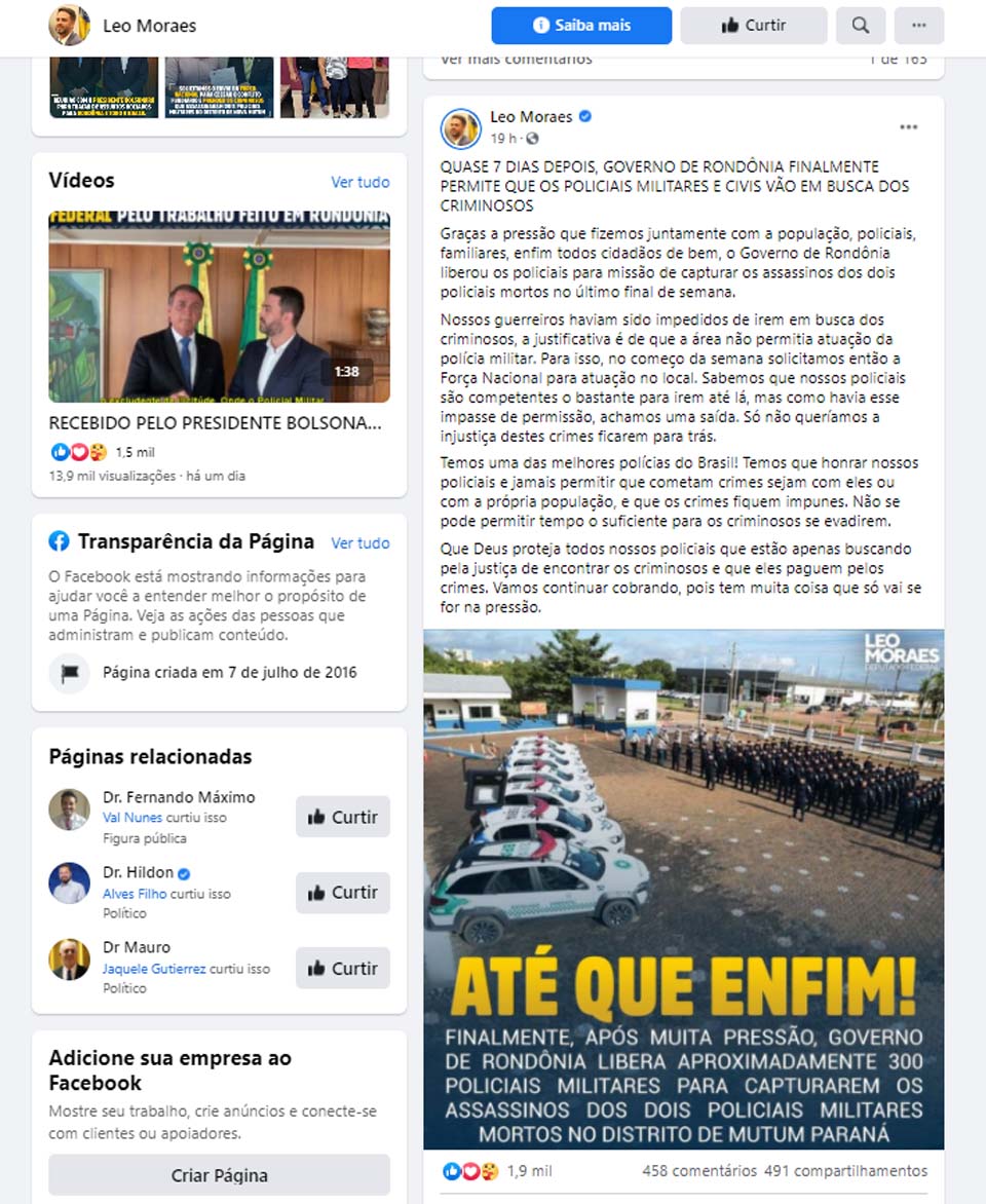 “Até que enfim! Finalmente, após muita pressão, Governo de Rondônia libera aproximadamente 300 policias militares para capturarem os assassinos dos dois policiais militares mortos no distrito de Mutum-Paraná”.