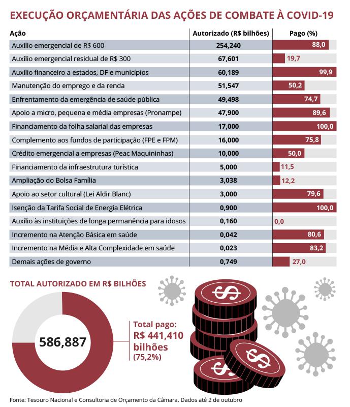 O orçamento criado neste ano para combater a pandemia de Covid-19 acumulou até 2 de outubro quase R$ 587 bilhões em despesas autorizadas. Desse total, mais de R$ 441 bilhões (75,2%) foram pagos, calculou a Consultoria de Orçamento da Câmara dos Deputados.
