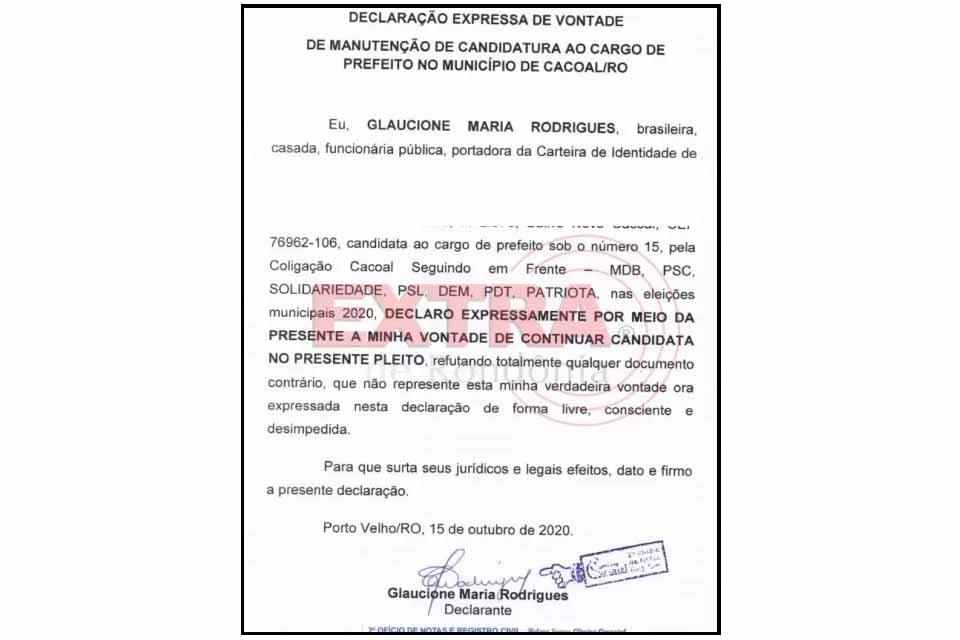 Glaucione, que está presa em Porto Velho, argumentou que a “renúncia”, assinada há mais de cinco dias, “não representa a sua verdadeira vontade livre, consciente e desimpedida” e manifestou por continuar candidata.