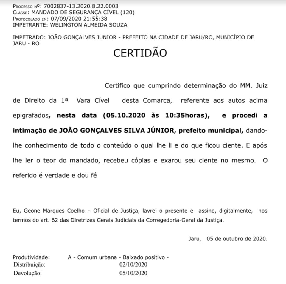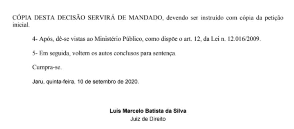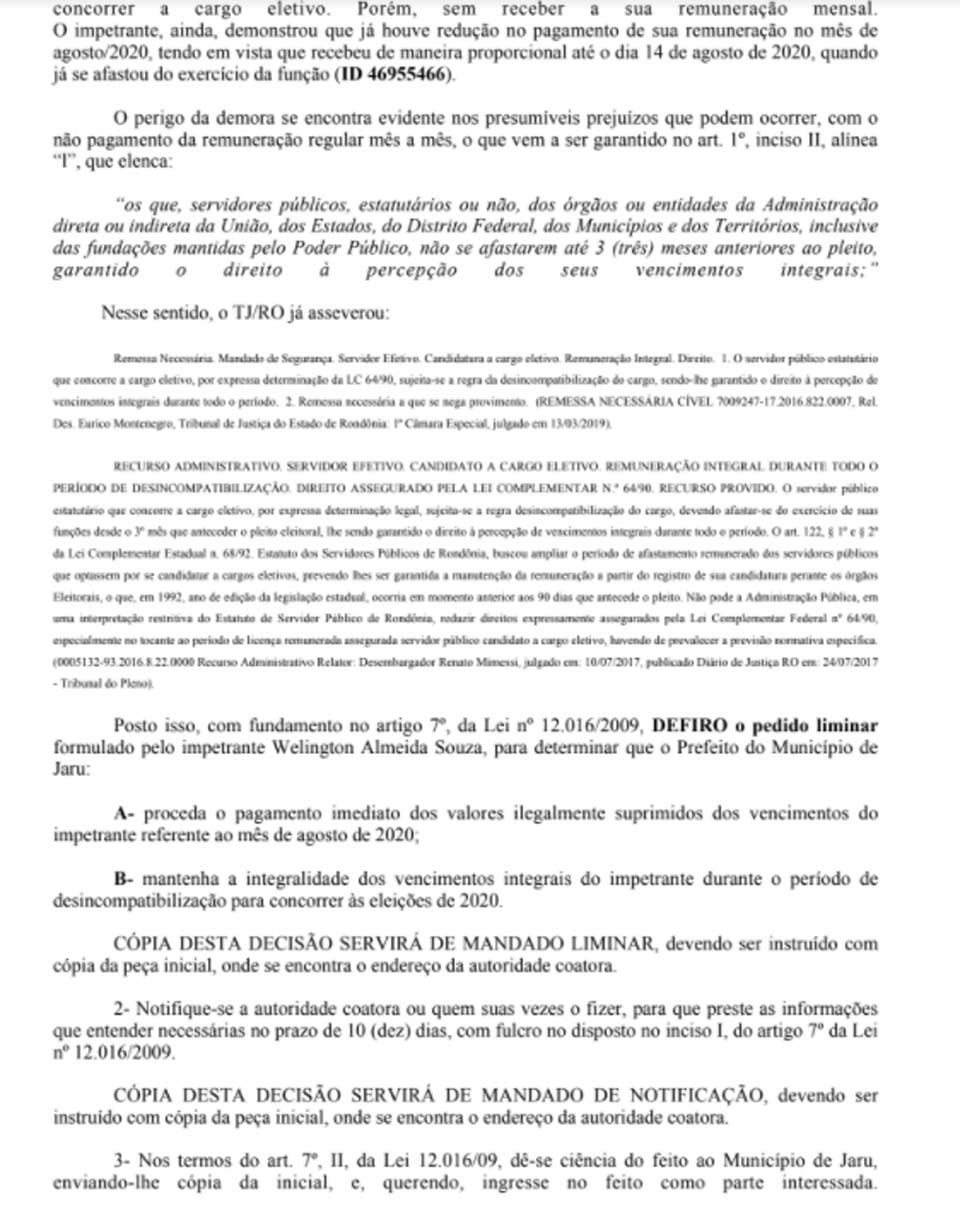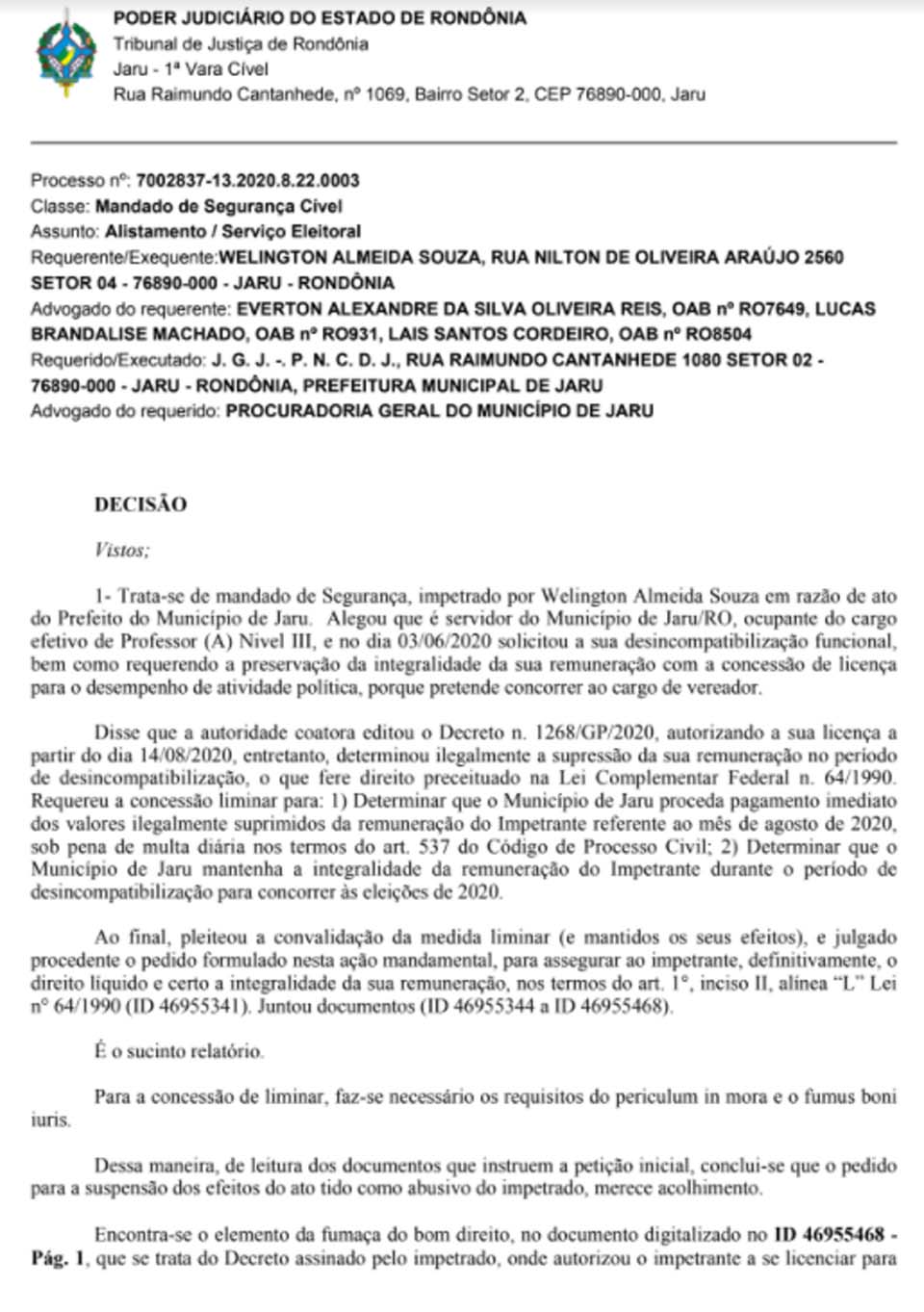 Porto Velho, RO – Em setembro deste ano, o juiz de Direito Luís Marcelo Batista da Silva, da 1ª Vara Cível de Jaru, concedeu liminar ao professor Welington Almeida Souza contra ato praticado pelo atual prefeito João Gonçalves Silva Júnior.