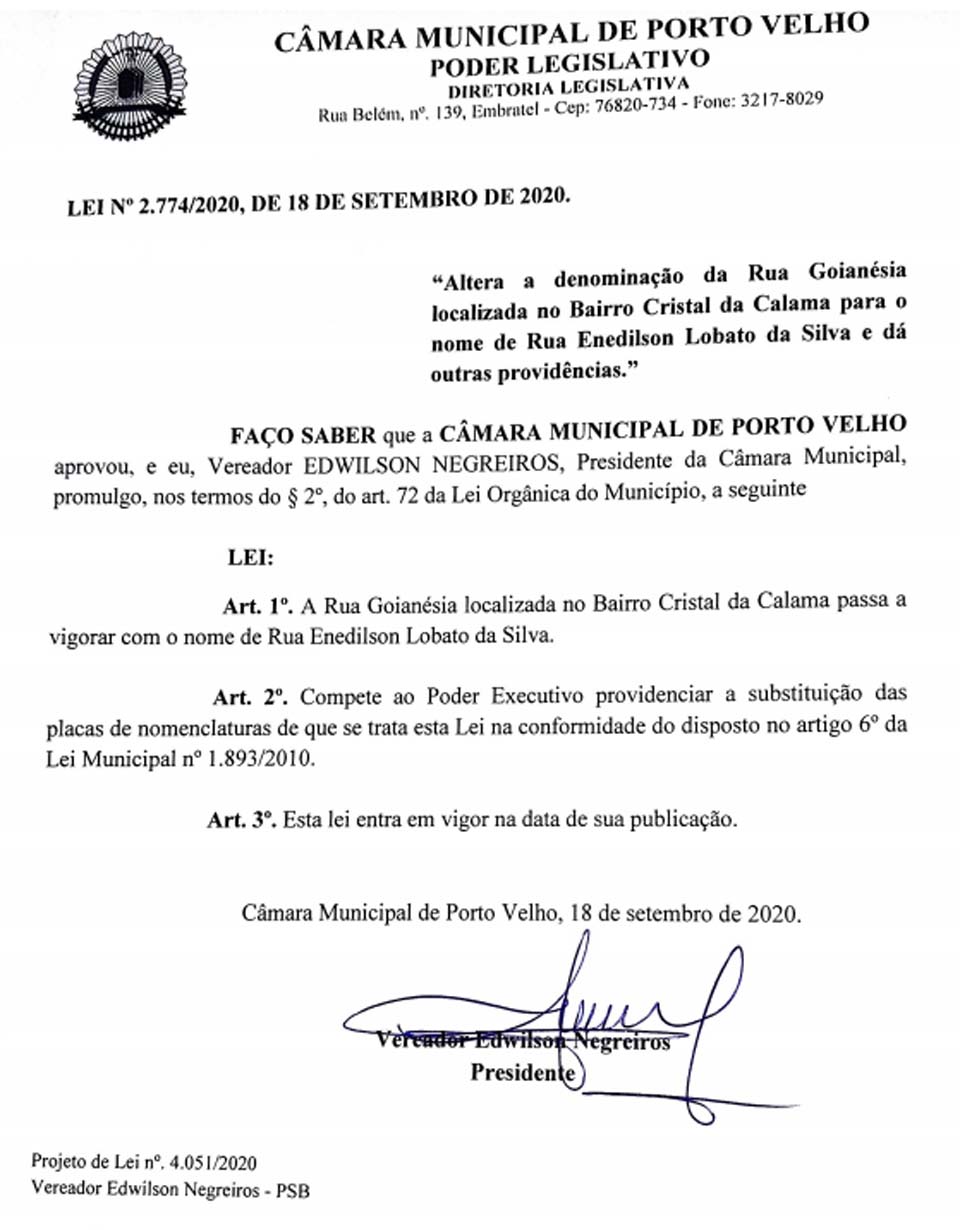 Porto Velho, RO – Em junho deste ano, o vereador-presidente da Câmara de Porto Velho Edwilson Negreiros, do PSB, apresentou Projeto de Lei a fim de que os demais membros do Legislativo municipal aprovem a alteração do nome da Rua Goianésia para Enedilson Lobato da Silva.
