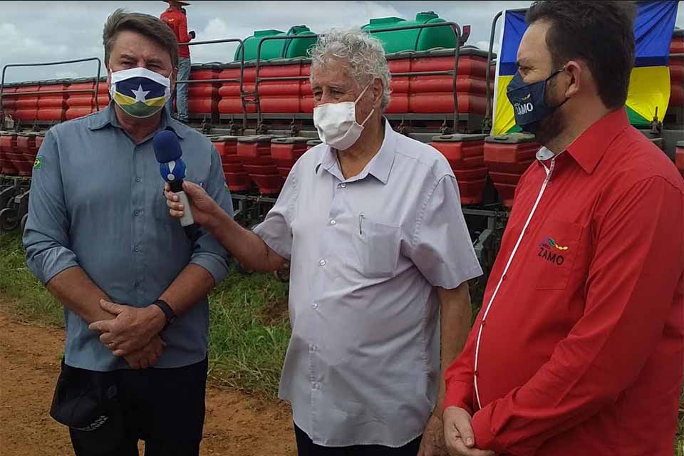 No último final de semana com a presença do Secretário de Agricultura, Evandro Padovani, o empresário Alysson Zamo deu inicio ao plantio de soja no distrito de Jacy-Paraná, no município de Porto Velho, distante da capital 120 quilômetros, onde estão sendo cultivadas 5.200 hectares da leguminosa pelo sistema direto de colocar a semente no solo após a colheita do milho safrinha para não degradar a área. Alysson Zamo esclarece que após a colheita da soja no mês de janeiro, ali, será plantada 3.200 hectares de arroz aproveitando os insumos e cobertura da terra deixada pela soja, sem nenhum desgaste para o meio-ambiente.