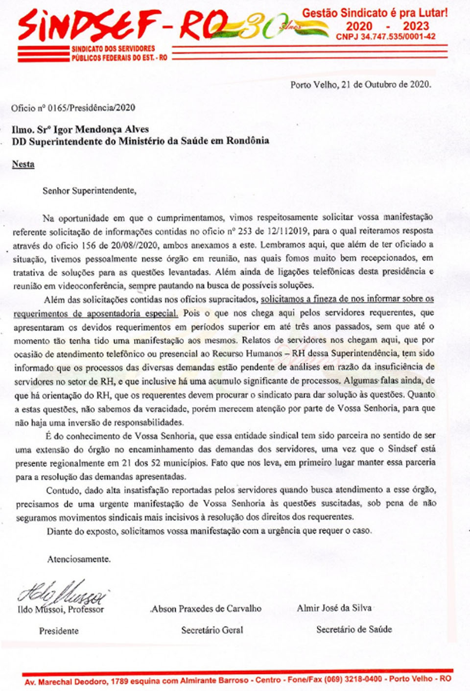 Entre as diversas tentativas de diálogo com Ministério da Saúde, o Sindicato dos Servidores Públicos Federais no Estado de Rondônia – Sindsef/RO, protocolou novamente, na tarde desta quarta-feira (21), documento solicitando da Superintendência do Órgão em Rondônia manifestação com urgência, sobre os diversos relatos apresentados por seus filiados.