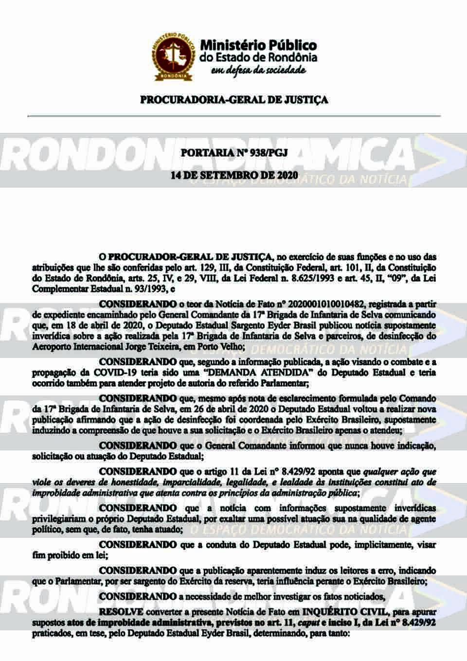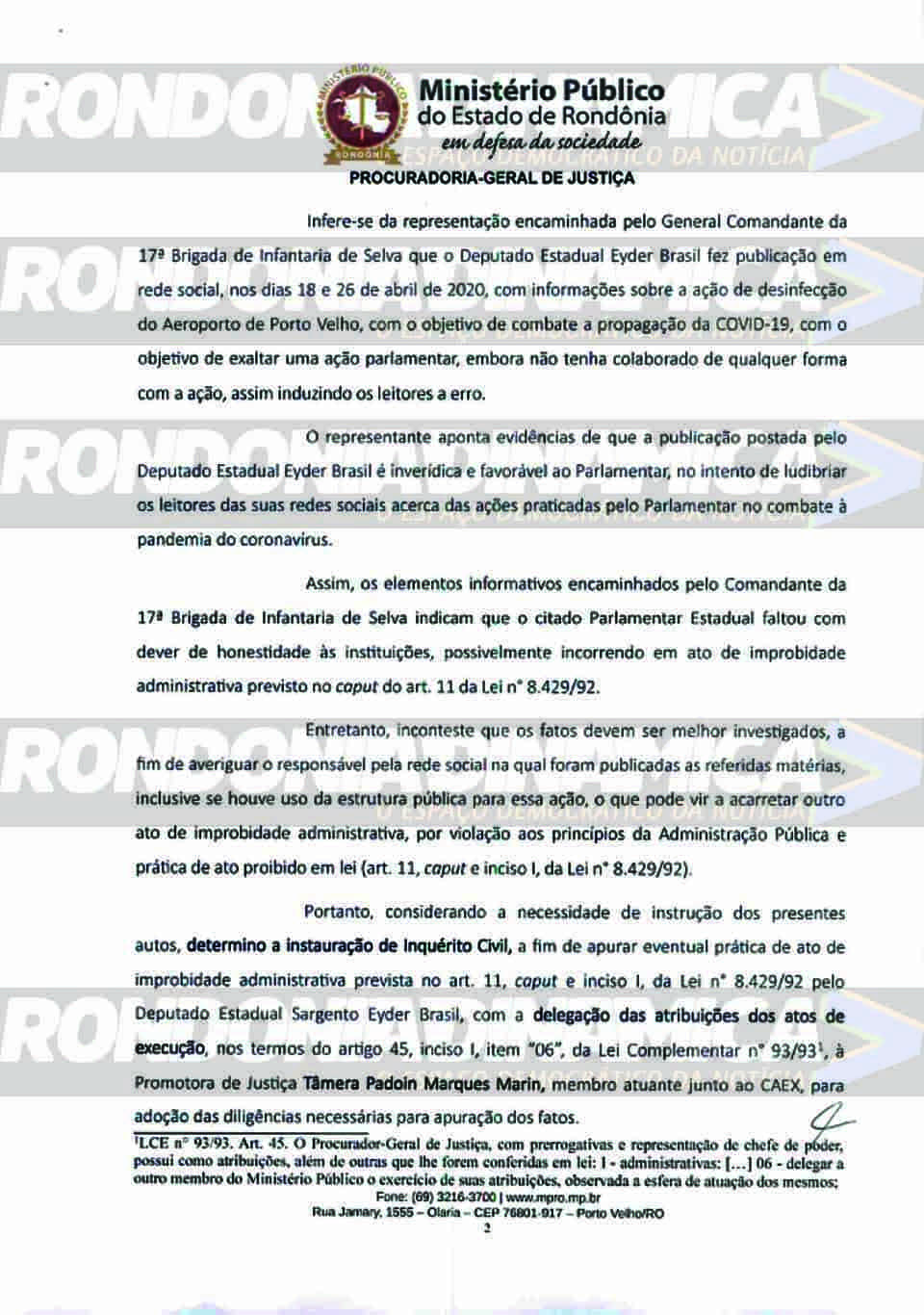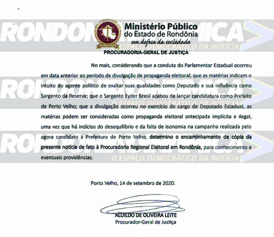 “No mais, considerando que a conduta do parlamentar estadual ocorreu em data anterior ao período de divulgação de propaganda eleitoral; que as matérias indicam intuito do agente público de exaltar suas qualidades como deputado e sua influência como Sargento da Reserva; que o Sargento Eyder Brasil acabou de lançar candidatura como prefeito de Porto Velho; que a divulgação ocorreu no exercício do cargo de deputado estadual, as matérias podem ser consideradas como propaganda eleitoral antecipada implícita e ilegal, uma vez que há indícios do desequilíbrio e da falta de isonomia na campanha pelo agora candidato à Prefeitura de Porto Velho”.