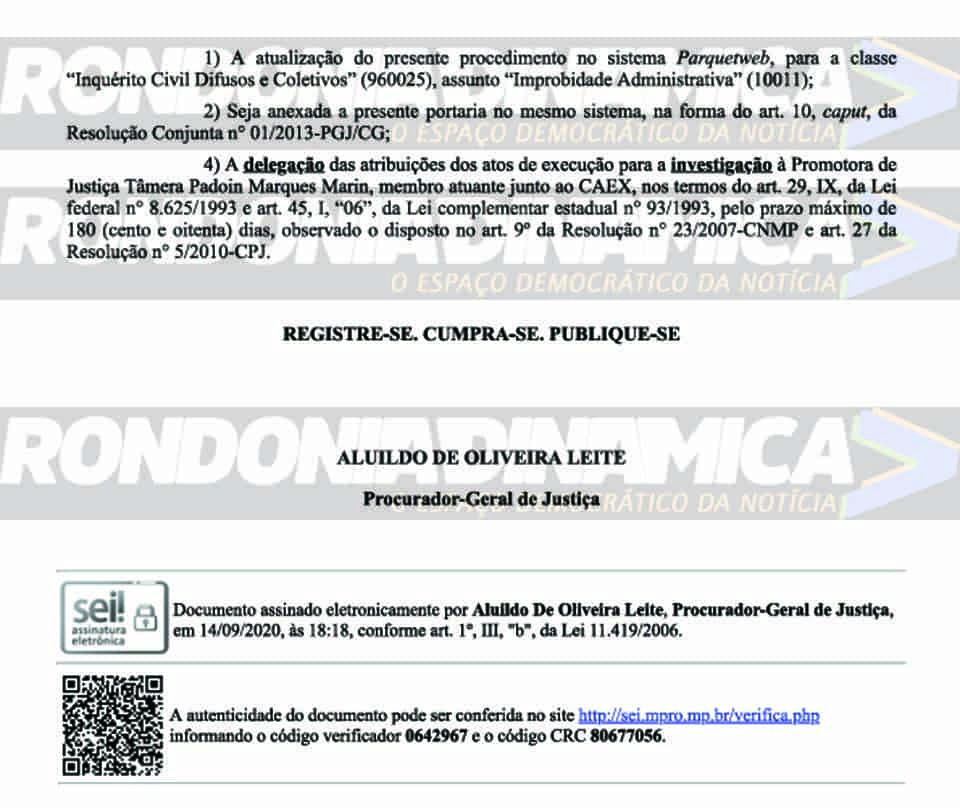 Ao final, instaurou o inquérito a fim de apurar os eventuais atos de improbidade administrativa denunciados pelo próprio Exército, delegando, em seguida, a responsabilidade de investigação à promotora de Justiça Tâmera Padoin Marques Marin.