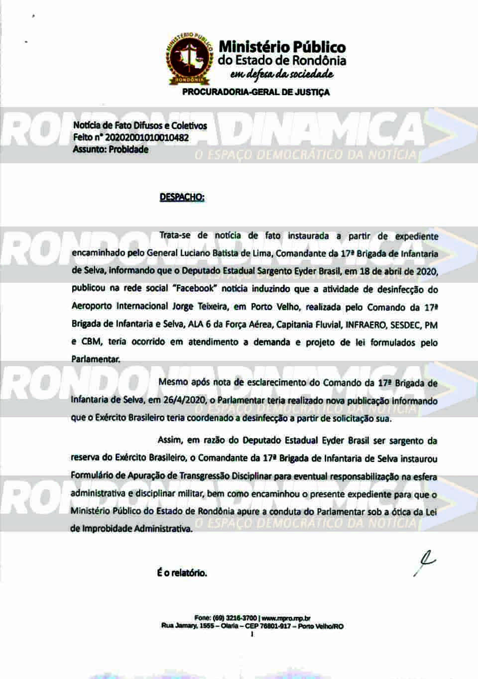 Porto Velho, RO – Por ter, segundo o Exército Brasileiro, supostamente mentido em notícias veiculadas na mídia local sobre ações de desinfecção no Aeroporto Internacional Jorge Teixeira, em Porto Velho, o deputado Eyder Brasil, do PSL, vai responder a três diferentes frentes de investigação. Os documentos foram obtidos exclusivamente pelo Rondônia Dinâmica.