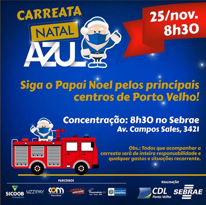O Natal Azul é uma campanha de promoção de vendas para turbinar as vendas de fim de ano e dar à população, oportunidades incríveis para garantir os presentes de Natal para toda a família. Nesta quarta (25), o Papai Noel Azul estará percorrendo as principais avenidas de Porto Velho.