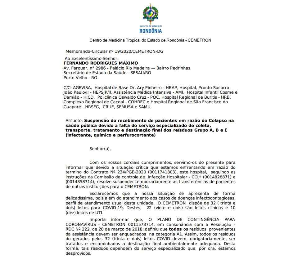 Porto Velho, RO – A diretora-geral do Centro de Medicina Tropical de Rondônia (CEMETRON) Stella Angela Tarallo Zimmerli elaborou comunicado ao secretário de Saúde Fernando Máximo.