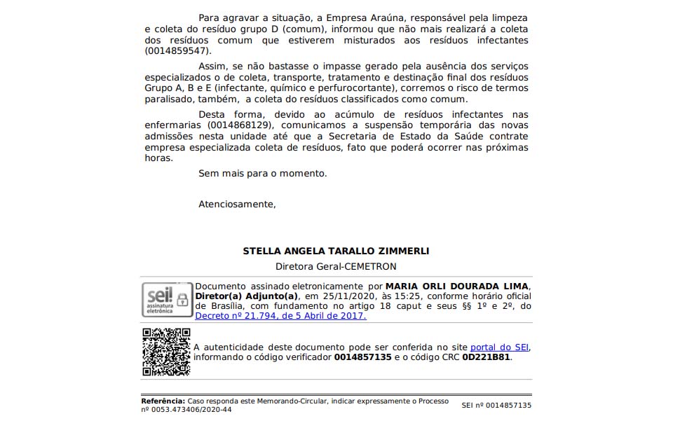 “Desta forma, devido ao acúmulo de resíduos infectantes nas enfermarias (0014868129), comunicamos a suspensão temporária das novas admissões nesta unidade até que a Secretaria de Estado da Saúde contrate empresa especializada coleta de resíduos, fato que poderá ocorrer nas próximas horas”, finalizou.