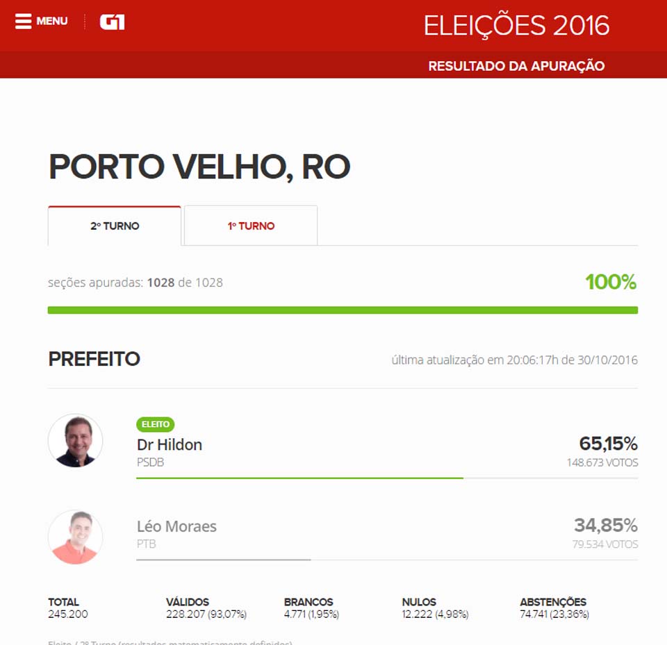 Em 2016, Hildon "bateu" Léo Moraes com mais de 69 mil votos à frente / Reprodução-G1