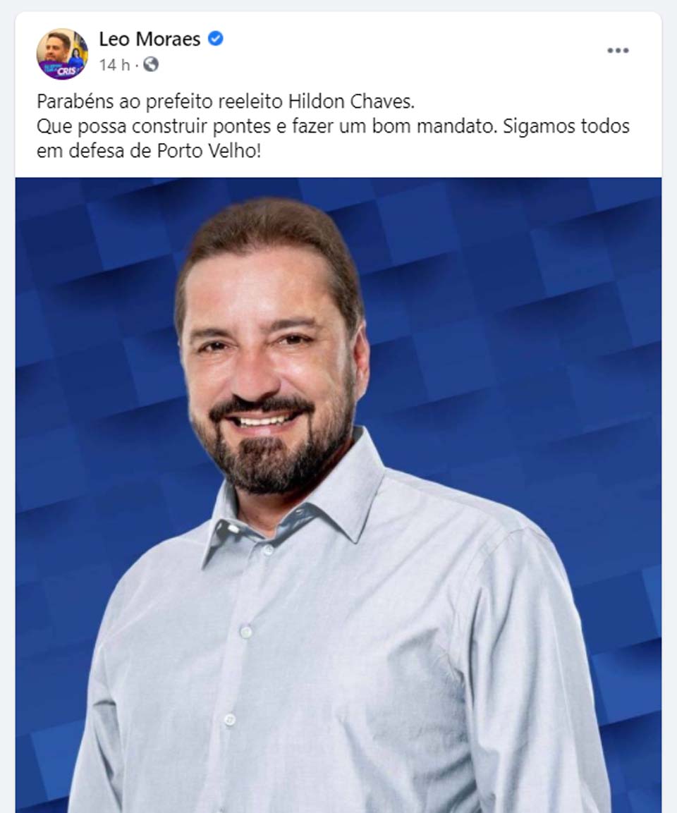 Léo Moraes parabenizou Chaves após o fim do segundo turno em Porto Velho / Reprodução-Facebook