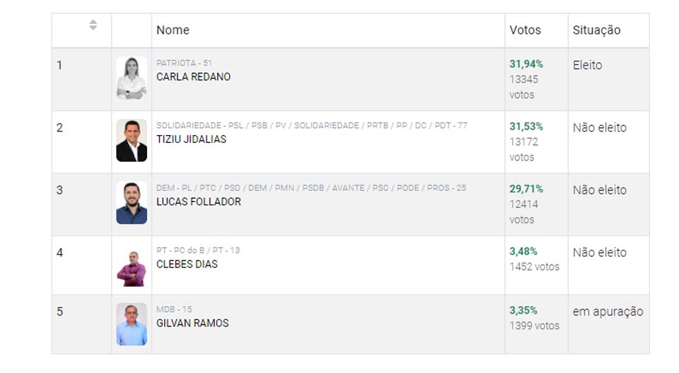 Carla ficou em primeiro lugar, com 31,94%; Tiziu Jidalias (Solidariedade), o segundo colocado, com 31,52%