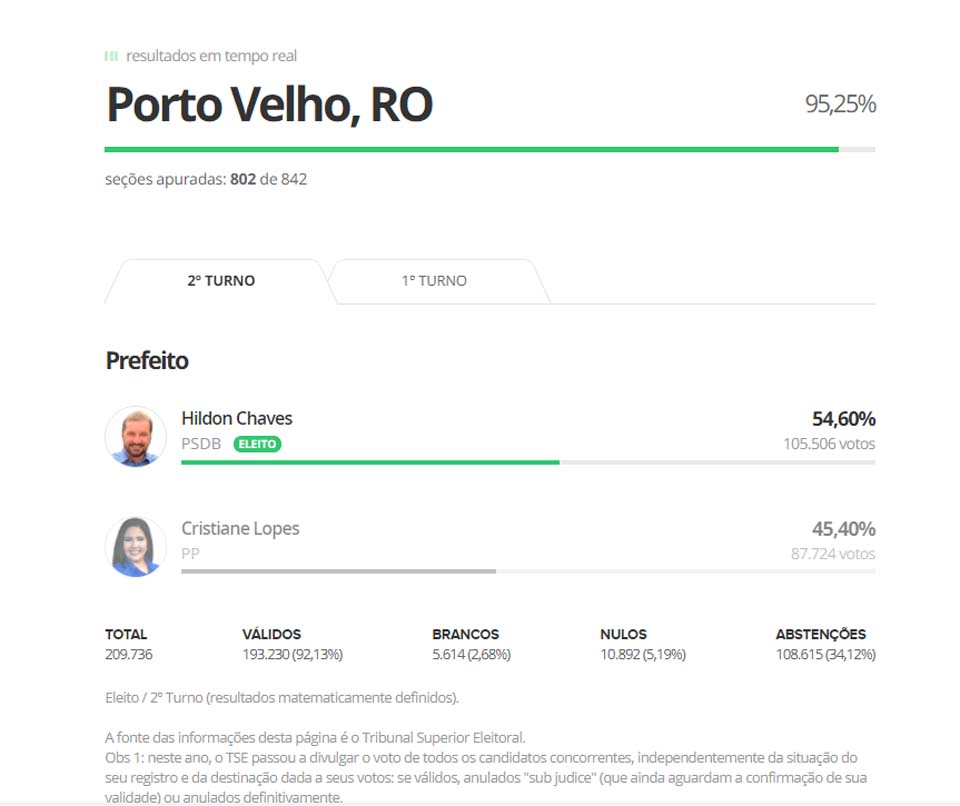 Aos 95%, o tucano alcançou 54,60% dos votos válidos contra 45,60% de Cristiane Lopes, do Progressitas.
