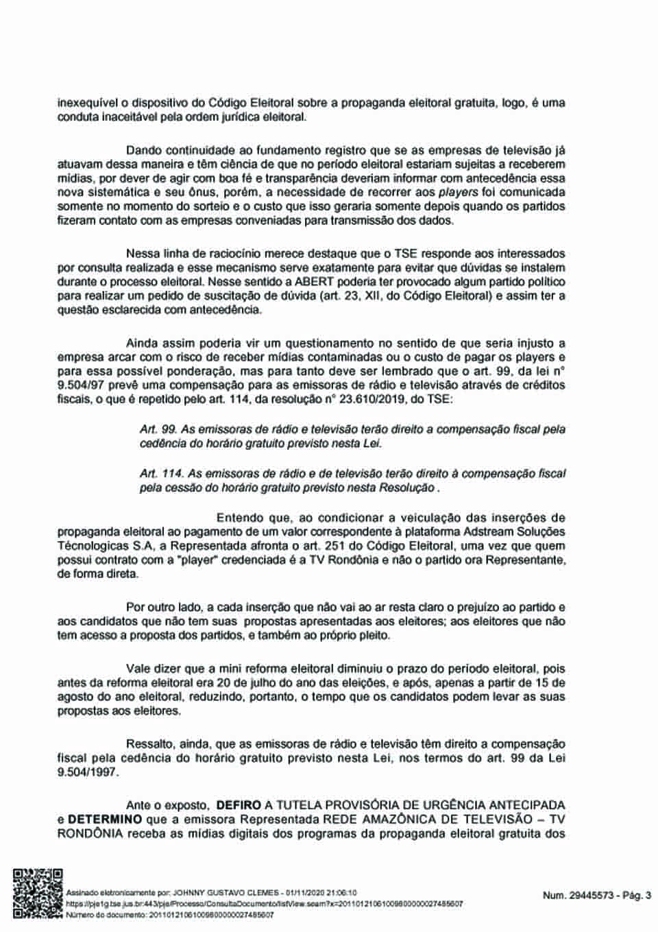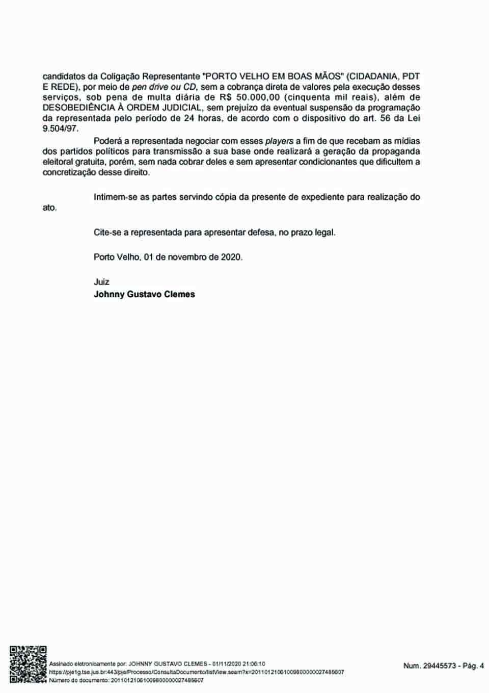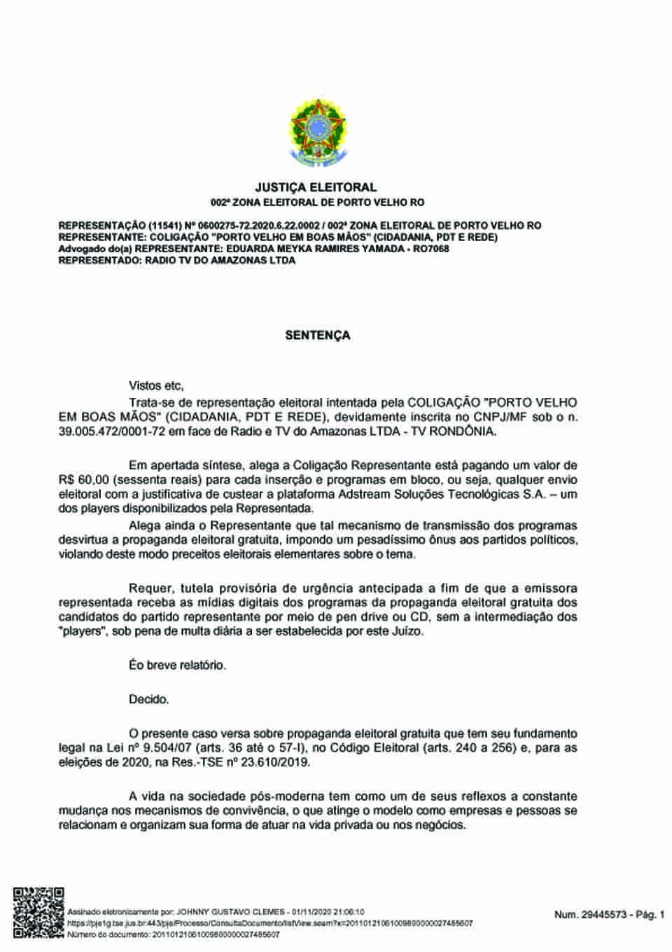 “Ante o exposto, defiro a tutela provisória de urgência antecipada e determino que a emissora representada Rede Amazônica de Televisão – TV Rondônia receba as mídias digitais dos programas da propaganda eleitoral gratuita dos candidatos da coligação representante "Porto Velho em Boas Mãos" (Cidadania, PDT e Rede), por meio de pen drive ou CD, sem a cobrança direta de valores pela execução desses serviços [...]”.