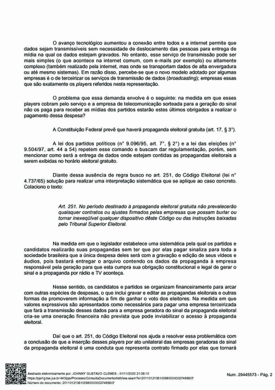 “Poderá a representada negociar com esses players a fim de que recebam as mídias dos partidos políticos para transmissão a sua base onde realizará a geração da propaganda eleitoral gratuita, porém, sem nada cobrar deles e sem apresentar condicionantes que dificultem a concretização desse direito”, concluiu.