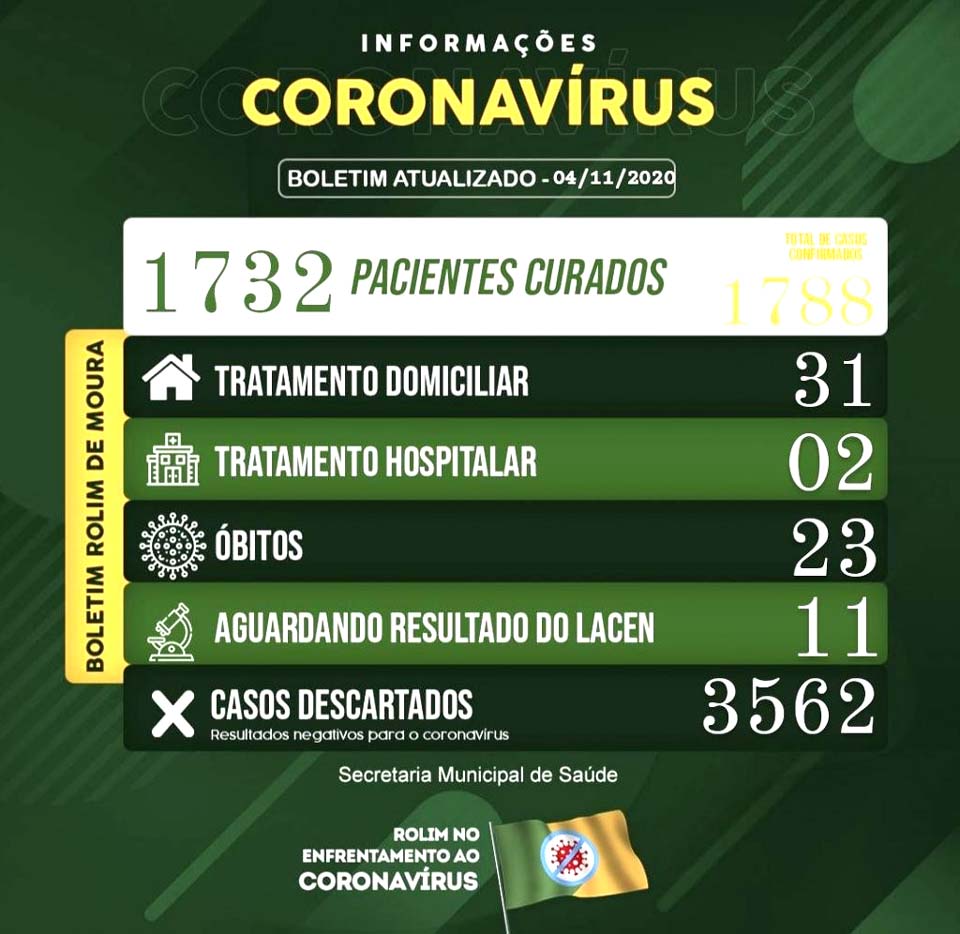 A secretária nicipal de Saúde de Rolim de Moura (RO), confirmou nesta quarta-feira, dia 04,1.788 casos registrados de coronavírus e em tra tamento domiciliar 31, confira o boletim: