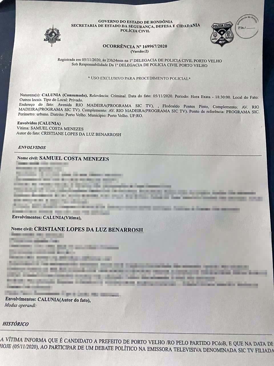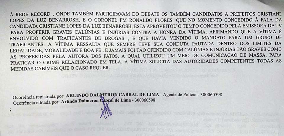 Ele aproveitou para dizer que, assim que acabasse o confronto retórico, iria à Delegacia de Polícia (PC/RO) registrar Boletim de Ocorrência (BO) contra a conduta de Cristiane, prometendo, ainda, mover ações judiciais tanto na esfera cível quanto criminal.