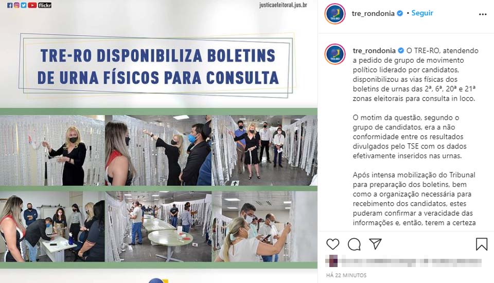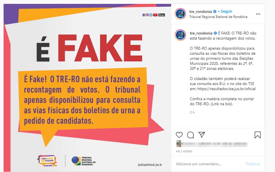 Porto Velho, RO – O Tribunal Regional Eleitoral de Rondônia (TRE/RO) usou seu canal no Instagram para alertar a população: qualquer informação sobre suposta recontagem de votos solicitada por candidatos perdedores é notícia falsa (fake news).