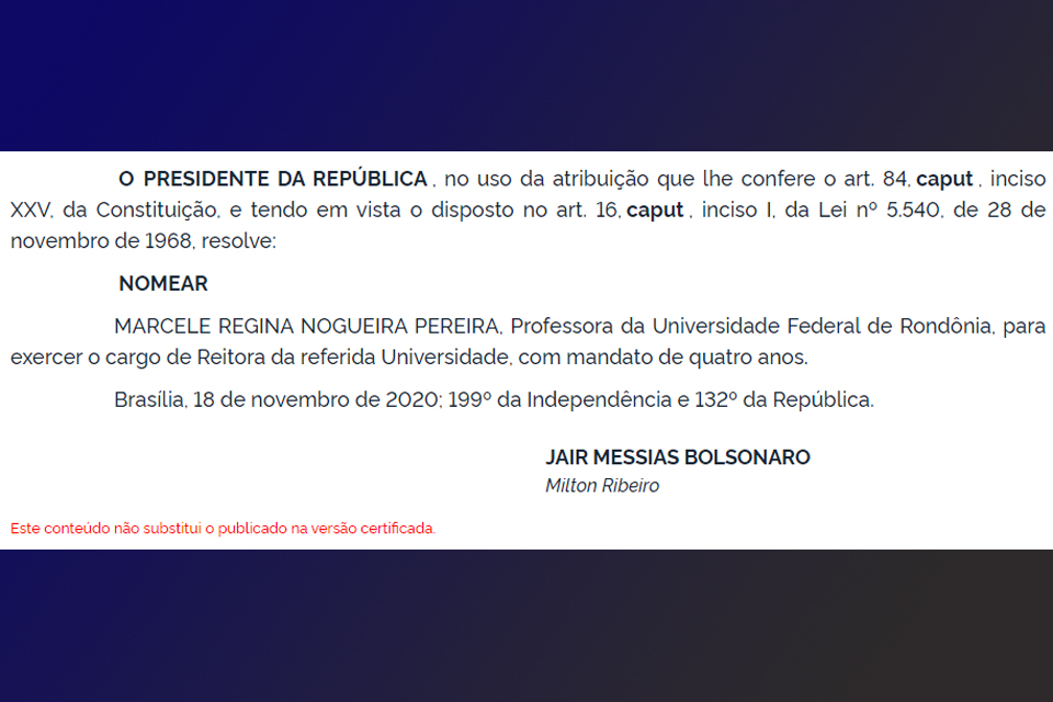 Porto Velho, RO – O presidente da República Jair Bolsonaro nomeou a reitora eleita da Universidade Federal de Rondônia (UNIR) Marcele Regina Nogueira Pereira.