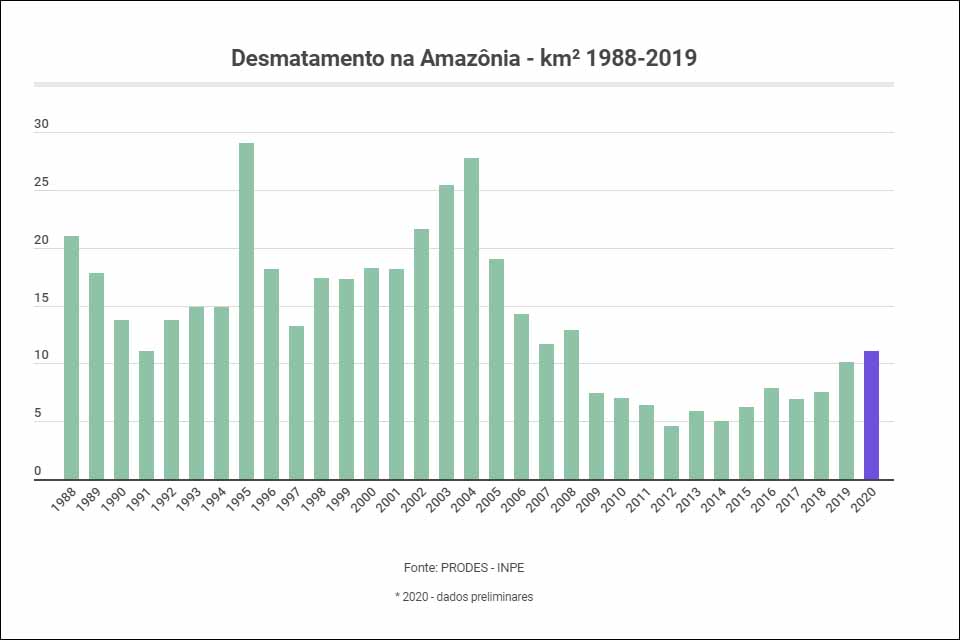 A cifra também é 2,8 vezes superior à meta fixada pela Política Nacional de Mudança do Clima para 2020, de 3.925 km², prevista na lei 12.187 de 2009 e em tratados internacionais firmados pelo Brasil, como o Acordo de Paris. A alta no desmatamento ocorre mesmo depois de 6 meses da presença das Forças Armadas na Amazônia.