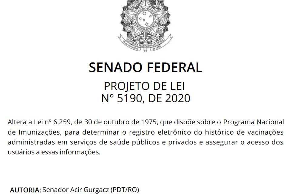 Desta forma, o PL 5190 de autoria do Senador Acir Gurgacz (PDT/RO) pretende alterar a Lei nº 6.259, de 30 de outubro de 1975, que dispõe sobre o Programa Nacional de Imunizações, para determinar o registro eletrônico do histórico de vacinações administradas em serviços de saúde públicos e privados e assegurar o acesso dos usuários a essas informações.