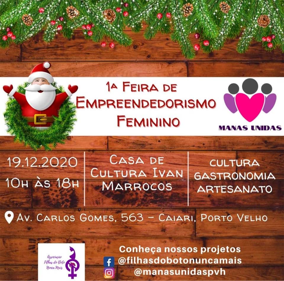 Neste fim de semana a capital receberá na casa de cultura Ivan Marrocos a feira de empreendedorismo feminino Manas unidas PVH. A feira é uma iniciativa da Associação Filhas do Boto Nunca Mais sob a coordenação da consultora da Redes Sociais Patrícia Fonseca. A feira contará com uma ampla variedade de produtos, oportunidade única para comprar aquela lembrancinha de natal para a família com preço justo e qualidade.
