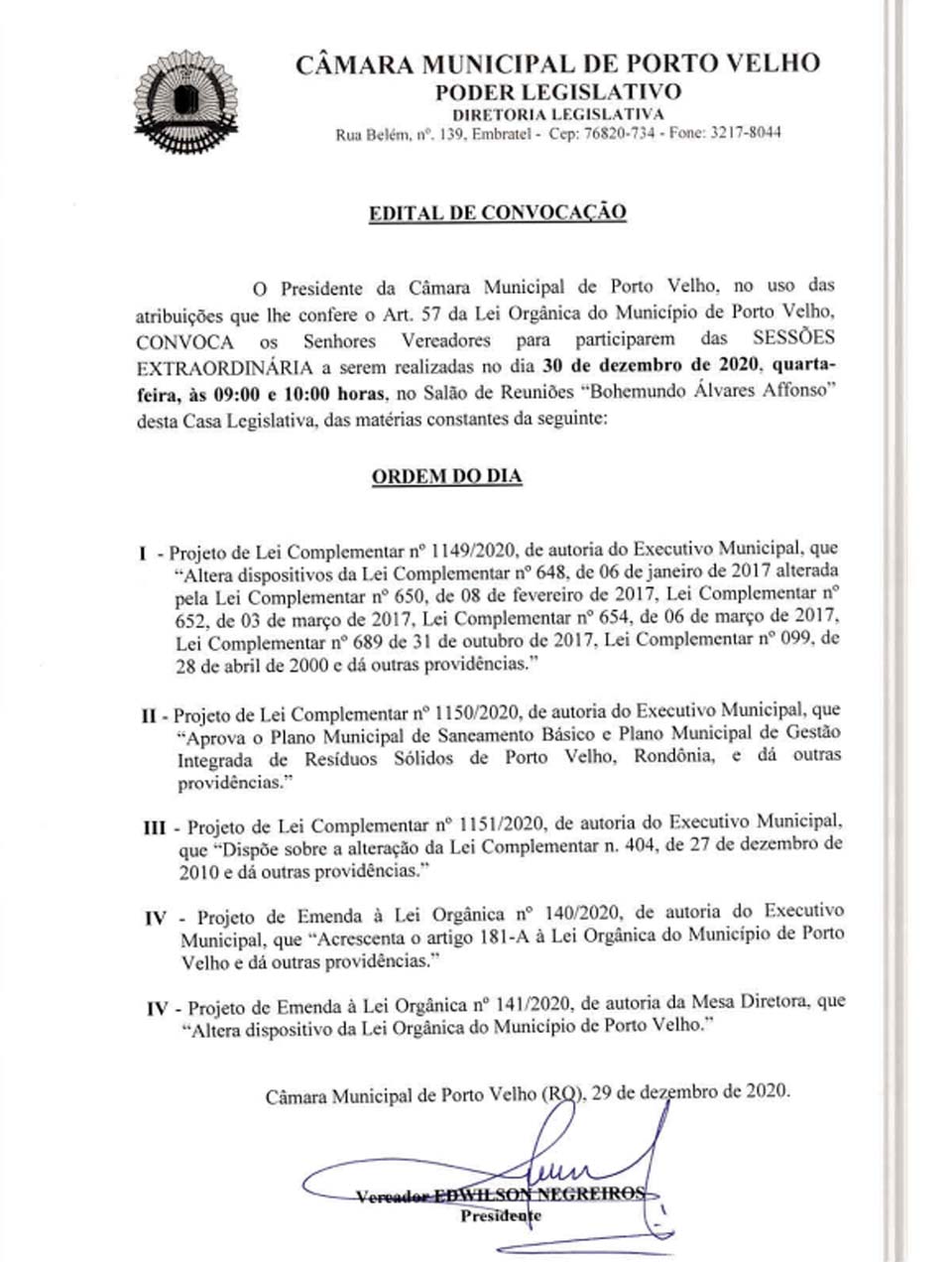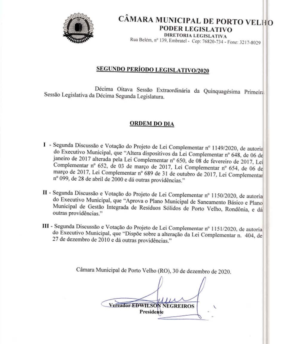 O Edital de Convocação formalizado pelo presidente do Poder-mirim, o vereador Edwilson Negreiros, do PSB, traz a pauta de discussão na íntegra, com os pontos votados pelos edis que participaram.