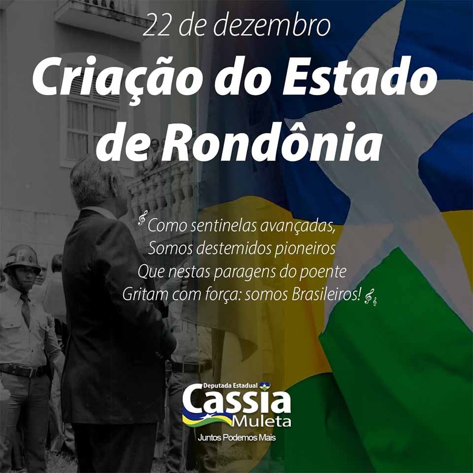 Em mensagem postada nas suas redes sociais na útlima terça-feira (22), a deputada estadual Cássia Muleta parabenizou o estado de Rondônia pelos 39 anos de sua instalação.