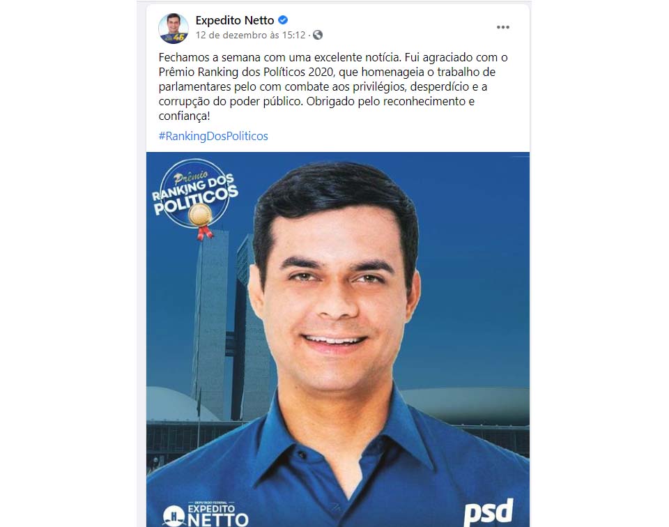 “Fechamos a semana com uma excelente notícia. Fui agraciado com o Prêmio Ranking dos Políticos 2020, que homenageia o trabalho de parlamentares pelo com combate aos privilégios, desperdício e a corrupção do poder público. Obrigado pelo reconhecimento e confiança!”, destacou.