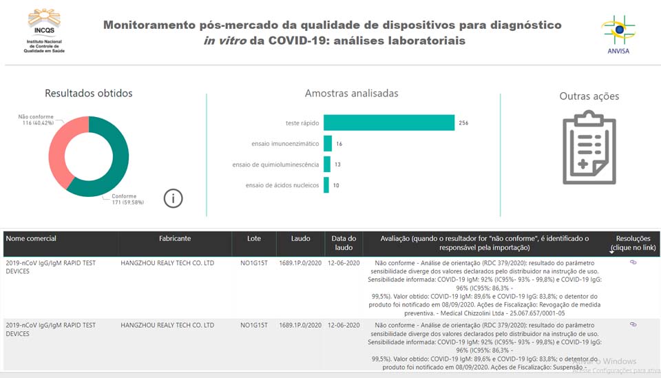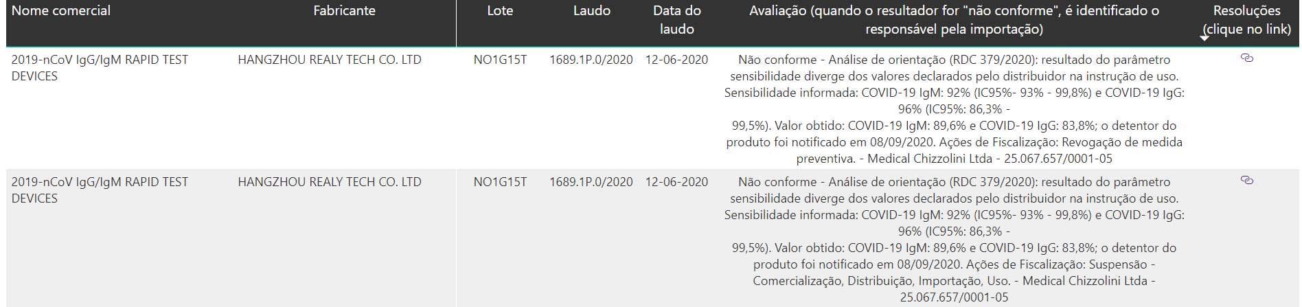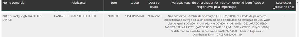 Por outro lado, a Anvisa enviou um link [https://tinyurl.com/testes-chineses] direcionando o usuário para a ala de “Monitoramento pós-mercado da qualidade de dispositivos para diagnóstico in vitro da COVID-19: análises laboratoriais”.