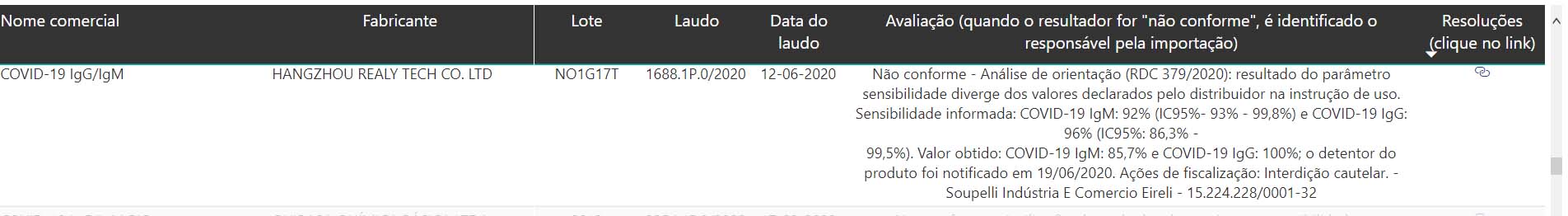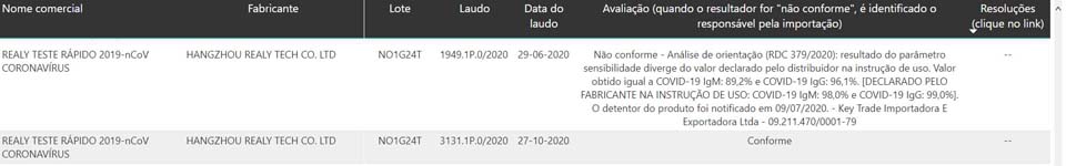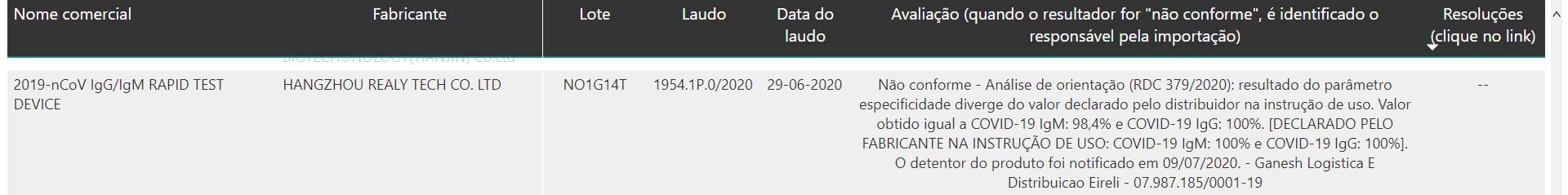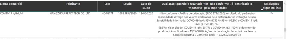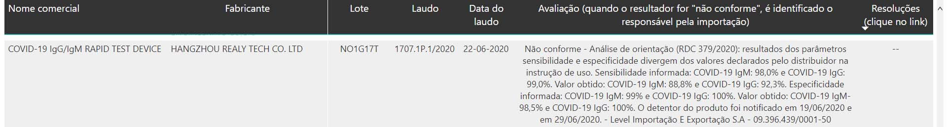 Nesta seção, quase todas todas as amostras – incluindo a da Level, que vendeu para Rondônia –, encaminhadas pelos adquirentes dos testes feitos pela chinesa Hangzhou Realy Teach foram tachadas como “Não conforme”, ou seja, sofreram espécie de reprovação porque os resultados divergiram dos valores de sensibilidade declarados pelo distribuidor na instrução de uso. Das sete amostras avaliadas tendo como fabricante a Hangzhou, apenas uma recebeu o selo "Conforme" do INCQS.