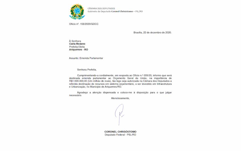 O deputado federal Coronel Chrisóstomo (PSL) se comprometeu a enviar a verba para a prefeitura de Ariquemes assim que o sistema orçamentário da Câmara dos Deputados autorizar a destinação de emendas individuais.