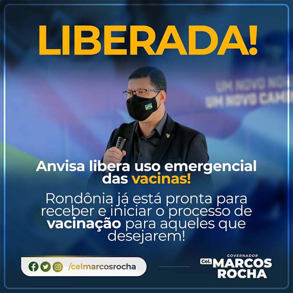 Porto Velho, RO – O governador Coronel Marcos Rocha, sem partido, usou as redes sociais a fim de comemorar a liberação das vacinas contra o Coronavírus (COVID-19/SARS-CoV-2) e o início da imunização em solo brasileiro.