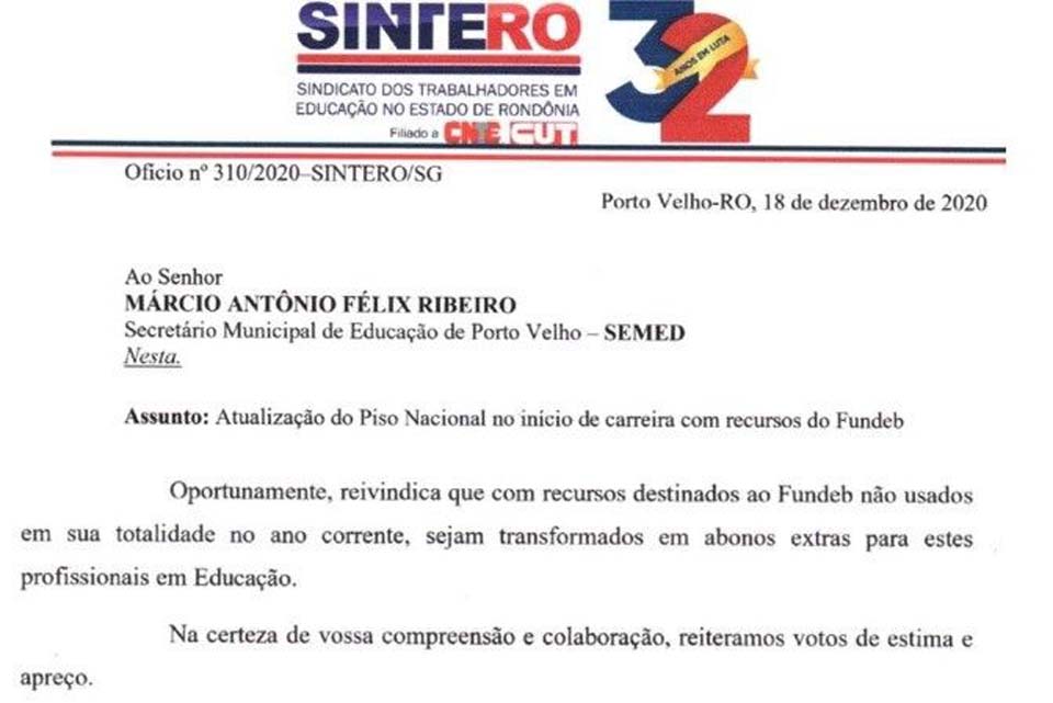 Em resposta ao requerimento formulado pelo Sintero, a Secretaria Municipal de Educação de Porto Velho (Semed) negou a utilização de sobras do Fundeb para pagamento de abono aos trabalhadores em educação do município. O pedido do Sintero tem fundamento no fato de que no mínimo 60% dos recursos do Fundeb devem ser utilizados para pagamento de salários, de acordo com a lei em vigor até dezembro de 2020, e que os outros 40%, se não forem utilizados em sua totalidade, podem ser transformados em abono, já que os recursos de um ano não podem ser utilizados para pagar despesas do ano seguinte.