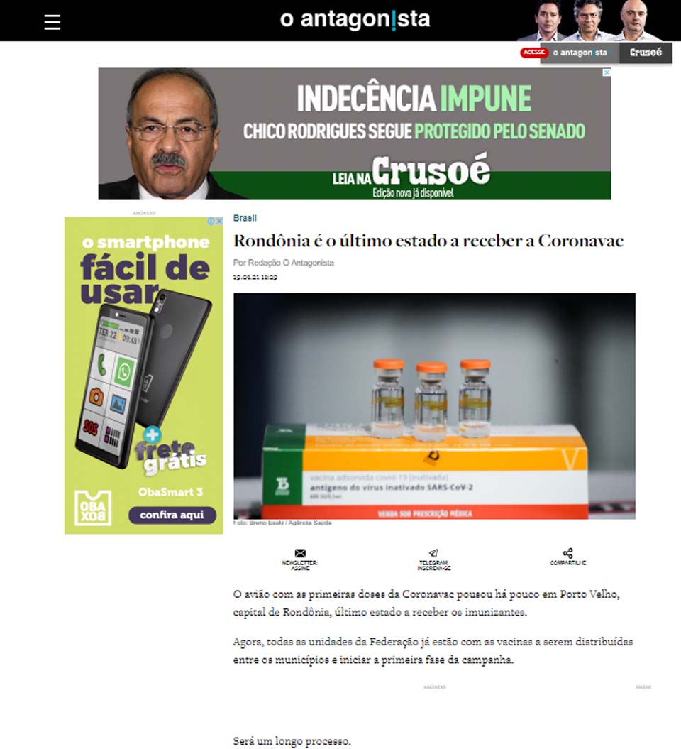 Porto Velho, RO – O site de notícias “O Antagonista”, de abrangência nacional, veiculou uma nota colocando Rondônia como o último estado da federação a receber as vacinas contra o Coroanvírus (COVID-19/SARS-CoV-2).