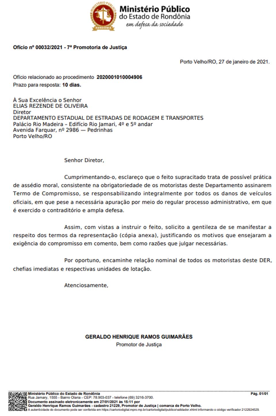O promotor de Justiça Geraldo Henrique Ramos Guimarães concedeu o prazo de 10 dias para que o diretor-geral do Departamento Estadual de Estradas de Rodagem e Transportes (DER/RO) explique os termos da denúncia sobre suposto assédio moral.