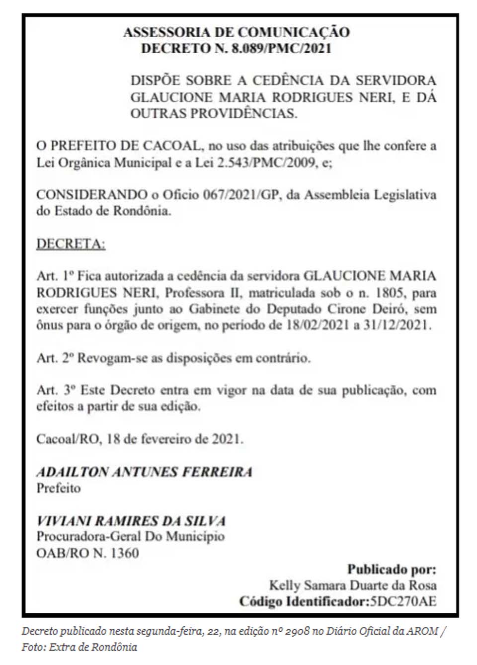 A cedência só foi possível porque o atual prefeito de Cacoal Adailton Antunes Ferreira, o Adaílton Fúria, do PSD, autorizou a transferência dela, que, em essência, é contratada como professora pelo município cacoalense.