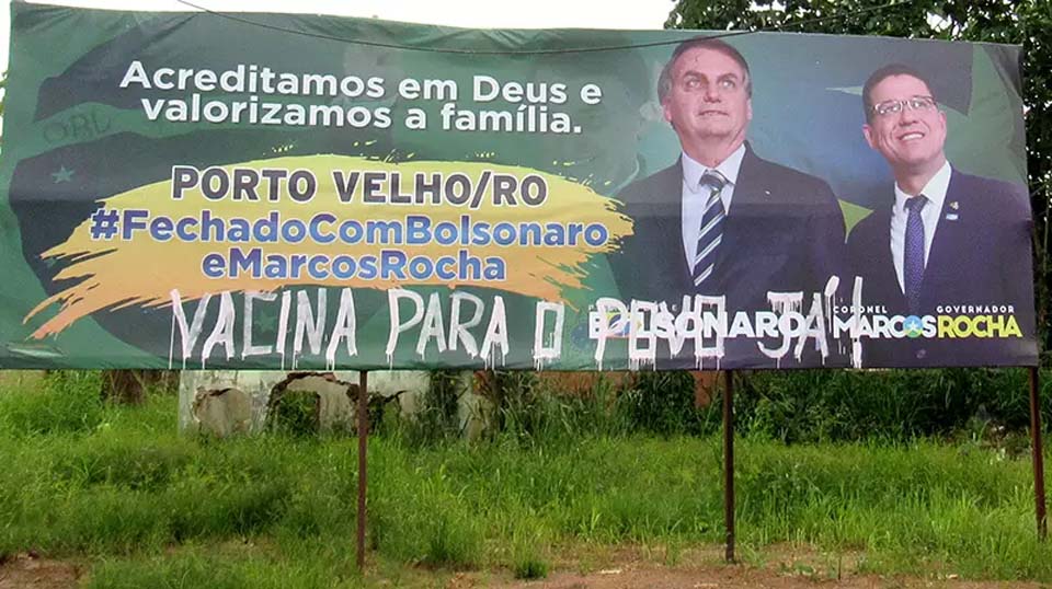 Entretanto, a mesma sentença foi sobreposta em um outdoor político onde estão as figuras do presidente da República Jair Bolsonaro, sem partido, e o governador Coronel Marcos Rocha, também fora de legenda.